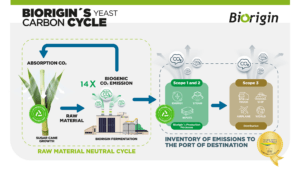 The Biogenic Carbon Cycle comes from the fermentation of sugarcane, the raw material used to produce yeast and yeast extract. During manufacturing, biogenic CO2 is released and later absorbed by the sugarcane plantation, forming a neutral cycle for the raw material.