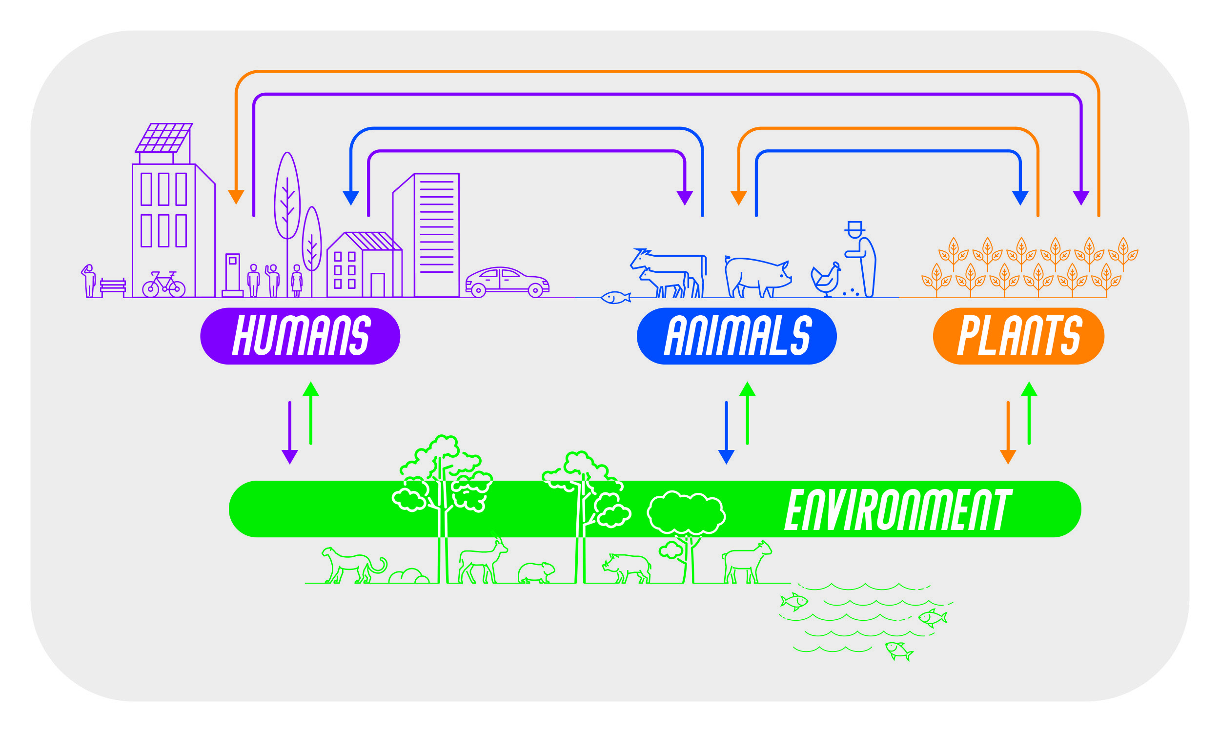 There is growing evidence that climate change, unsustainable agricultural practices, globalization, and wildlife trade increase the risk of disease transmission between animals and humans and cause environmental imbalance. In this context, understanding our interdependence is essential, as illustrated below.