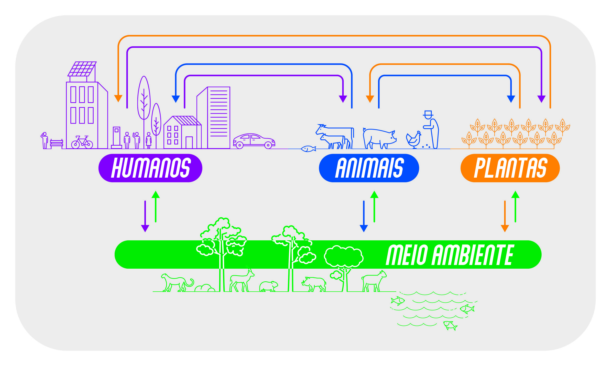 Torna-se cada vez mais evidente como as mudanças climáticas, a agricultura insustentável, a globalização e o comércio de vida selvagem aumentam o risco de transmissão de doenças entre animais e seres humanos, bem como desequilibram o meio ambiente. Nesse contexto, compreender nossa interdependência é essencial, como ilustrado a seguir.